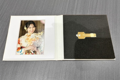 お写真1枚と、8カット(30〜50ポーズ)のデータを収録した、鍵型のおしゃれなUSBがセットになったアルバムです。